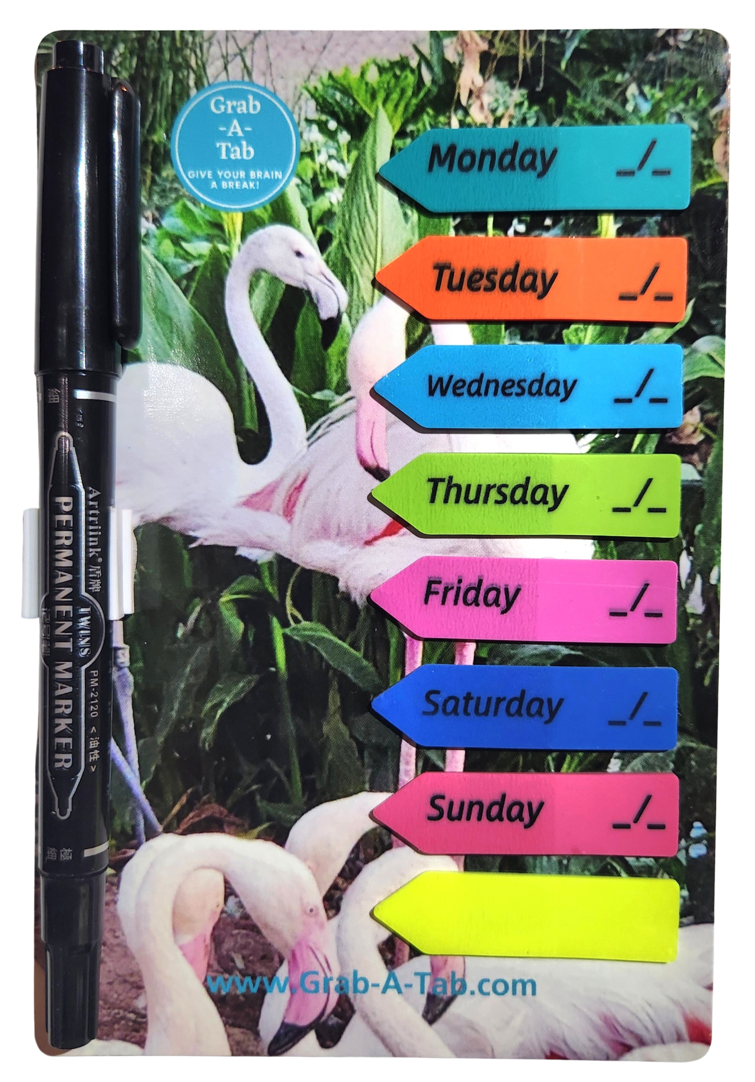 4” x 6” magnet for your refrigerator that has 8 sticky tabs in total, 7 days of the week plus 1 blank set just in case (20 tabs per day)